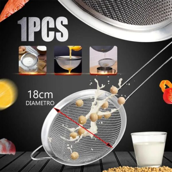 Eleva tu experiencia culinaria con el Colador Con Mango, Aro Y Malla Fina De Acero Inoxidable de 18cm. Este utensilio de cocina esencial es perfecto para una variedad de tareas, desde colar pasta hasta tamizar harina para tus recetas de reposter?a. Fabricado con acero inoxidable de alta calidad, este colador es resistente y duradero, garantizando un rendimiento confiable durante a?os. Su malla fina es ideal para eliminar cualquier part?cula no deseada, asegurando que tus preparaciones sean suaves y sin grumos. ? Hecho en acero Inoxidable. ? Di?metro: 18cm. ? Profundidad: 5cm. ? Color: Plata