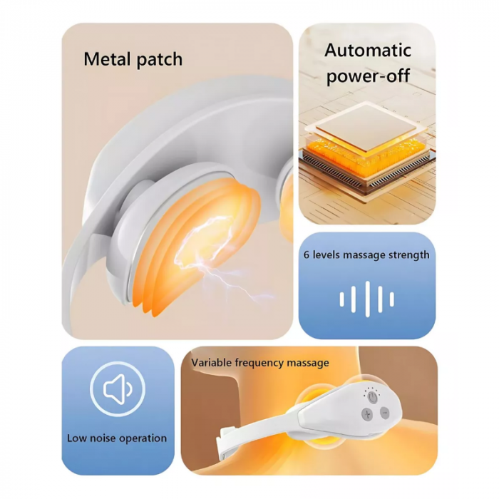 1. Mant?n pulsado el bot?n de encendido durante 2 segundos para encender y apagar la m?quina.2. Pulsa brevemente el bot?n + para aumentar la potencia. Hay un total de m?ltiples marchas y seis modos de masaje para elegir.3. De baja frecuencia, alivia el dolor de cuello, c?modo, ligero y port?til, se apaga autom?ticamente despu?s de 15 minutos de trabajo.4. El producto adopta una tecnolog?a de brazo telesc?pico fuerte, que tiene una buena resiliencia y una gran tenacidad.5. F?cil de cargar y bater?a de larga duraci?n.Especificaci?n:Material: ABSTipo de art?culo: masaje y relajaci?nN?mero de modelo: masajeador de cuello de pulsoFuente de alimentaci?n: 3,7 VTama?o del producto: 143x130x145mmCapacidad de la bater?a: 150mAhFuente de alimentaci?n de carga: 5V 0,1-1APotencia nominal: 1W