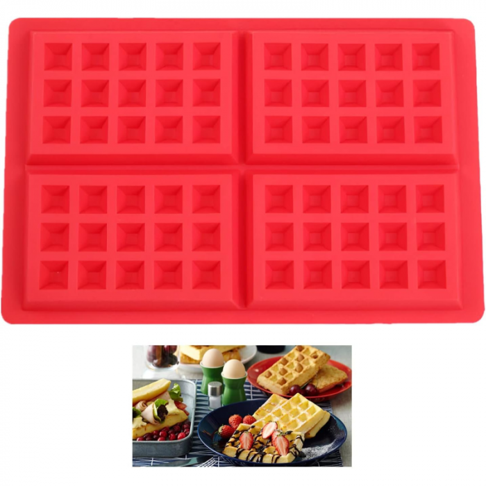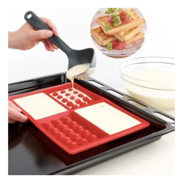 Molde de silicona wafflera. ? Dise?o: rectangular. ? Apto para horno, microondas, freezer, heladera. ? Superficie antiadherente, f?cil de limpiar. ? No retiene olores ni sabores. ? Plegable para f?cil guardado. ? COLORES: SURTIDO. ? Medidas total: 28cm largo x 18cm ancho x 2cm alto. ? Medida de cada cavidad: 12.5cm x 8cm x 1.5cm profundidad. ? Silicona grado alimenticio. ? Libre de BPA.