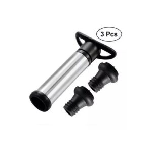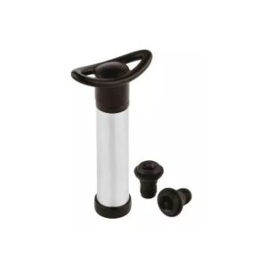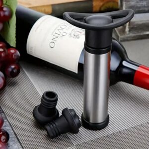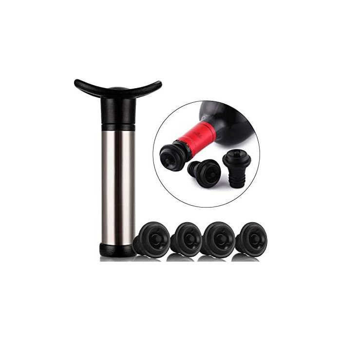 ? Bomba de vac?o manual para botellas de vino ? Un regalo ideal para los amantes del vino, ya que se adapta a la mayor?a de botellas de vino y champagne. ? Manten? el vino fresco durante m?s tiempo: los tapones de vac?o pueden reducir la oxidaci?n del vino absorbiendo el aire en la botella. ? Simplemente bombeando la botella varias veces hasta que se succiona firmemente. ? Puede mantener el vino fresco durante 7 d?as al vac?o. ? Material de grado alimenticio: la bomba de vac?o est? hecha de material ABS avanzado y los tapones de vino est?n hechos de silicona de grado alimenticio. ? Es inofensivo para el cuerpo humano. F?cil de limpiar: reutilizable y apto para lavavajillas. C?mo se usa: ? Paso 1: Inserte el tap?n en el cuello de la botella. ? Paso 2: Coloque la bomba en el tap?n firmemente, tire de la manija hacia arriba y hacia abajo durante aproximadamente 15 veces.
