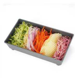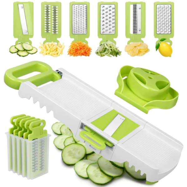 Rallador de alimentos manual 6 en 1 Cuenta con 6 cuchillas intercambiables para distintos tipos de corte. Tu tarea de cortar sera m?s f?cil gracias a este asistente imprescindible para la cocina. F?cil de usar: la cortadora est? equipada con una base de contenedor de alimentos antideslizante, que puede almacenar las verduras y frutas cortadas en categor?as, reduciendo el desorden en la tabla de cortar de la cocina, de modo que a veces ni siquiera necesita una tabla de cortar.