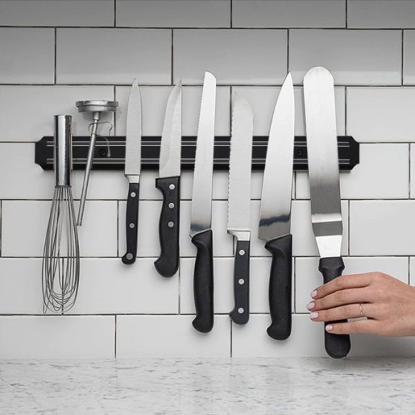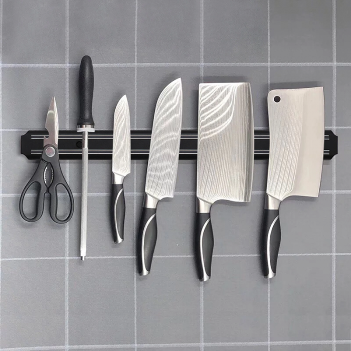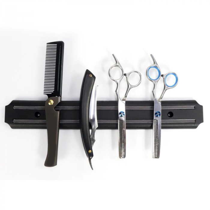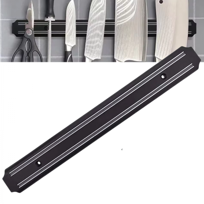 Barra magnetica de 38cm Ancho de 5cm Color: Negro Iman con alto poder de agarre, posee doble linea de imanes Incluye kit de instalacion
