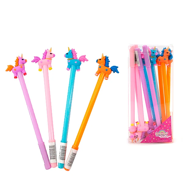 Boligrafo Trendy 15580. Diseño de unicornios en colores variados. Tinta gel azul, la caja incluye 12 unidades. Material: 80% Plastico + 20% Pvc.