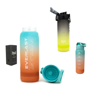 Botella Everlast 17369 Color: Aqua con naranja y Negro con verde. Medidas: 26cm de alto x 8cm de diametro. Material: 1000 ml / PC/ Incluye packaging, tapa con pico e interna de silicona, asa integrada, medidor