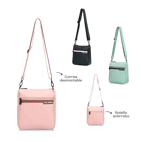 Morral Trendy 17501 Color: Negro, verde y rosa. Medidas: 24cm de alto x 22cm de ancho x 8cm de profundidad. Material: 100% PU