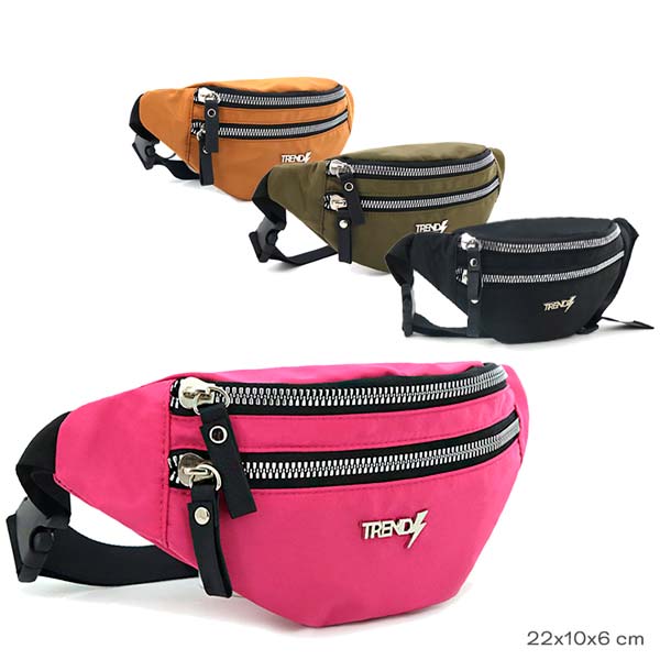 Riñonera Trendy 14854. Colores: Negro, suela, fucsia y verde. Material: 100% poliéster. Medidas: 14 cm de alto x 30 cm de ancho x 7 cm de profundidad.